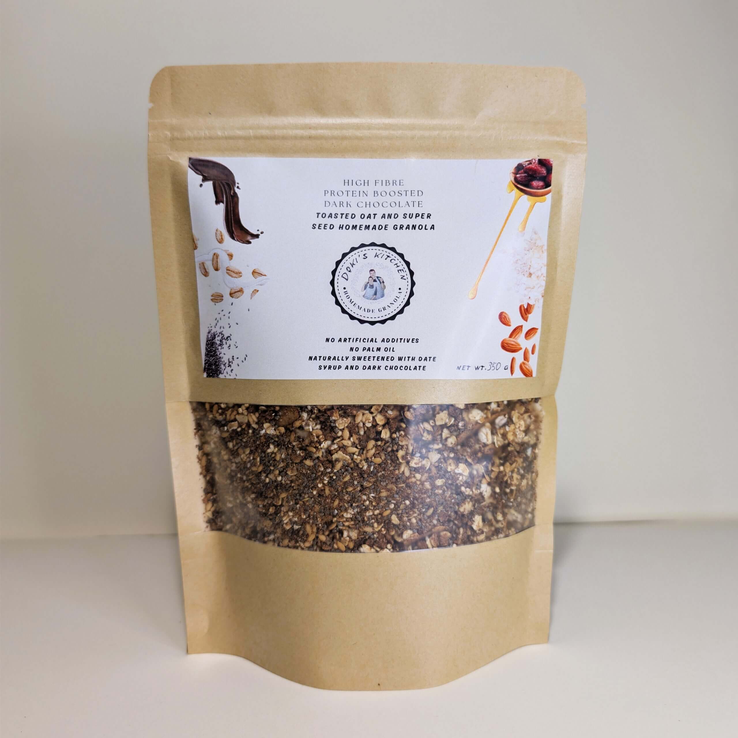 We slowly toast our high fibre protein granola for deep flavour and crunch. It combines rolled oats with chia, flaxseeds and homemade popped quinoa, as well as dark chocolate and almonds. This package contains 350 g or approximately 10 servings based on a 35 g portion.