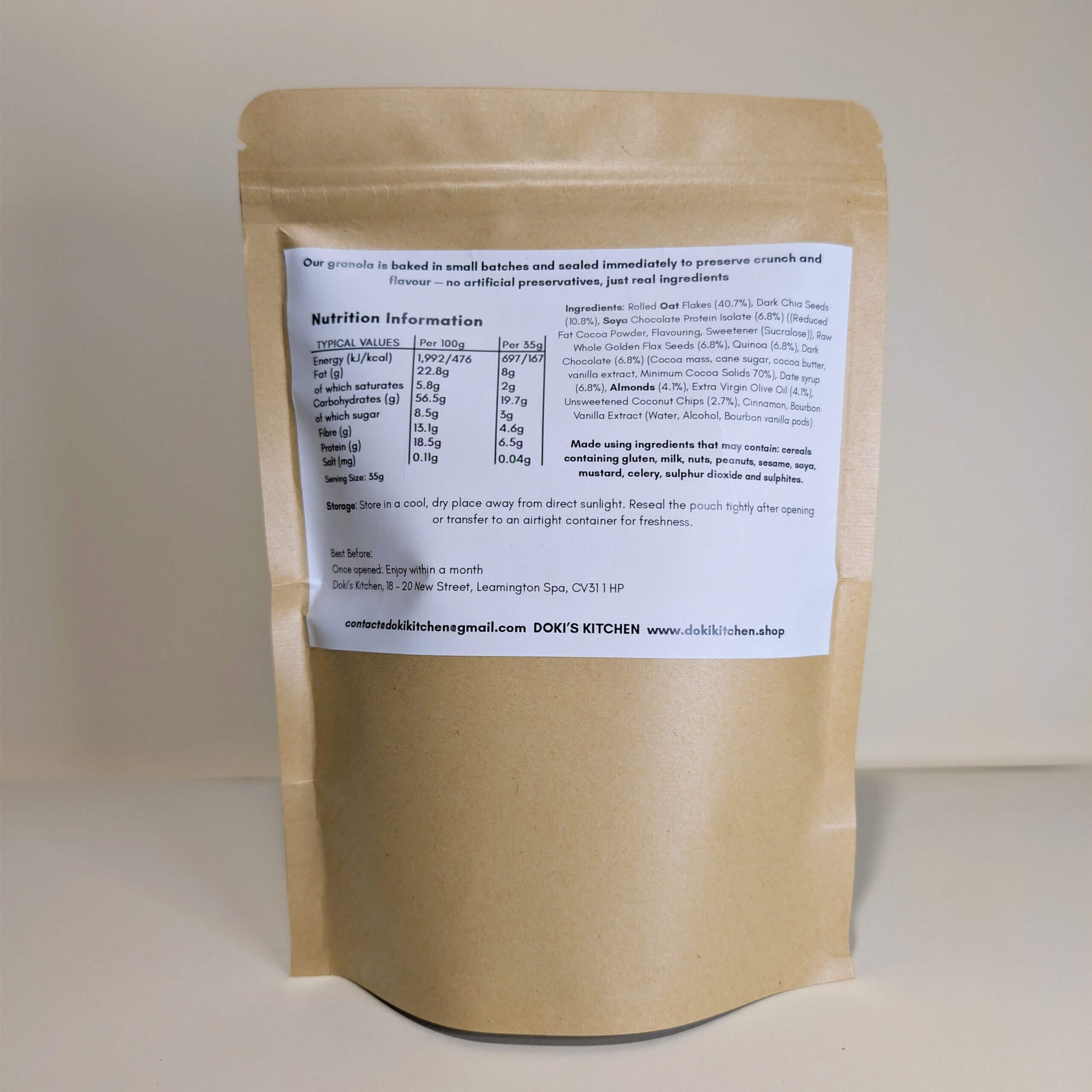 Rolled Oat Flakes (40.7%), Dark Chia Seeds (10.8%), Soya Chocolate Protein Isolate (6.8%)((Reduced Fat Cocoa Powder, Flavouring, Sweetener: Sucralose), Raw Whole Golden Flax Seeds (6.8%), Quinoa (6.8%), Dark Chocolate (6.8%)(Cocoa mass, Cane sugar, Cocoa Butter, Vanilla Extract; Minimum Cocoa Solids 70%), Date Syrup (6.8%), Almonds (4.1%), Extra Virgin Olive Oil (4.1%), Unsweetened Coconut Chips (2.7%), Cinnamon, Bourbon Vanilla Extract (Water, Alcohol, Bourbon Vanilla Pods).